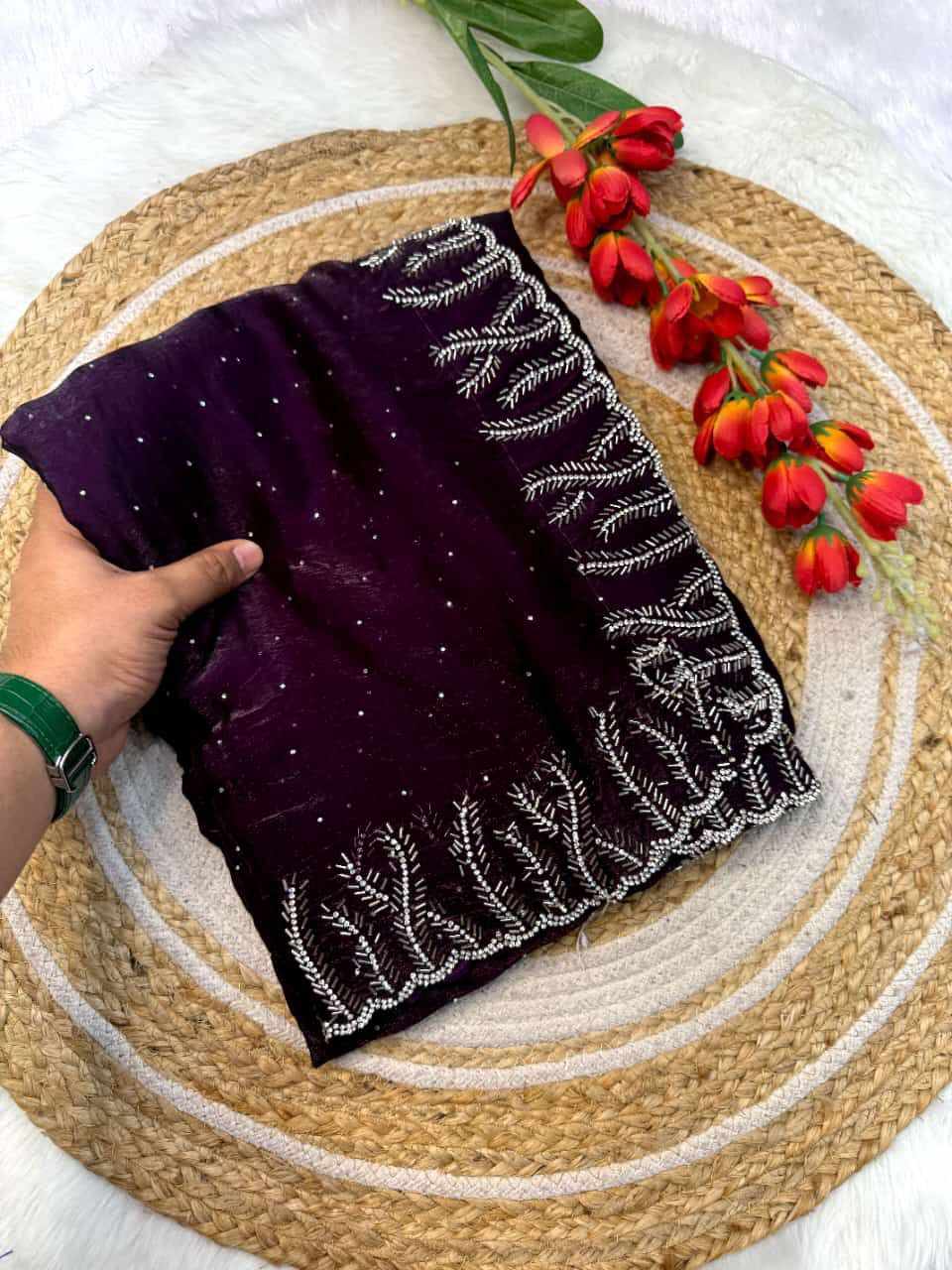 SAREES: Fandy satin silk with val moti jarkhand